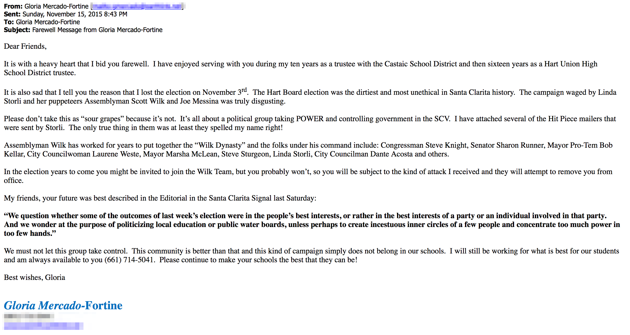 Back in 2015, Gloria Mercado-Fortine launched what became known as the infamous “Wilk Mafia” scare campaign. After losing her reelection bid on the Hart School Board, Gloria fired off a dramatic farewell email claiming the election had been stolen by a shadowy political syndicate supposedly run by then-Assemblyman Scott Wilk. She even named alleged conspirators—Steve Knight, Sharon Runner, Bob Kellar, Laurene Weste, Marsha McLean, and others—painting the whole thing as some grand right-wing coup that stretched from Palmdale all the way to Washington, D.C. Wild stuff.